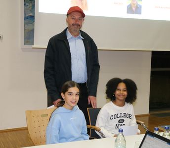 Viel Beifall erhielten im Gemeinderat die beiden Schülerinnen Eleni Onsando (rechts) und Emilia Schmidt aus der 4. Klasse der Grundschule Wilhelmsdorf. Sie trugen die Ergebnisse der Kinderbeteiligung im Rahmen der Jugendarbeit in Wilhelmsdorf vor und erhielten für ihren engagierten Vortrag Lob aus den Reihen der Räte und von den Zuhörern. Im Hintergrund Jens Braunschmid, Kinder- und Jugendbeauftragter der Gemeinde.